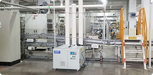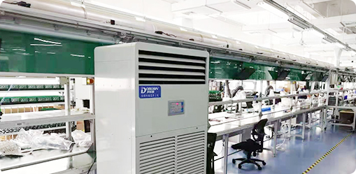 针对电子行业的需求,多乐信湿膜加湿机能够快速均匀加湿,保证车间内的湿度能控制在50%~60%之间, 减少因湿度过低所带来的损失,防止金属零件被腐蚀和零件机械强度下降,确保产品的质量和性能不会因 为湿度过高而受到影响。